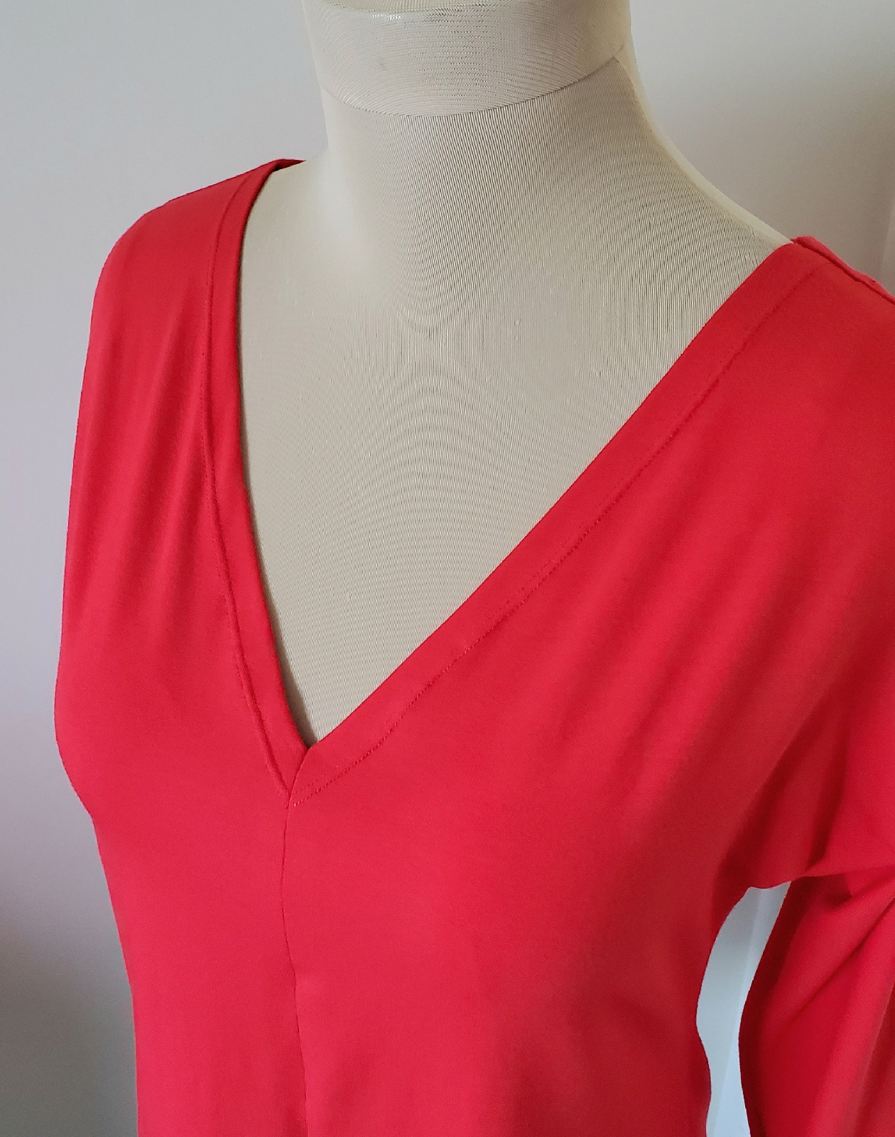 I love the deep v-neck and it laid properly on me and Ellie my dress-form.